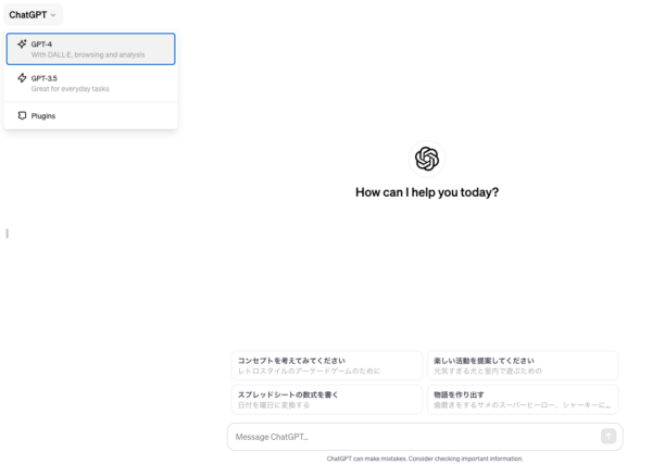下記のように、GPT-4、GPT-3.5、Pluginの3つになりました。これまでは、GPT-4の中でも機能が細分化されていました。