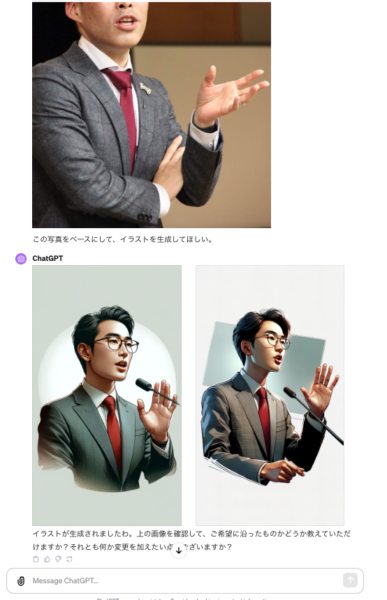 今までは、プロンプトを出力させて、その上で、DALL-E3で生成してもらうという2段階必要でしたが、今回のアップデートで一回の指示で画像生成までしてもらえます。
