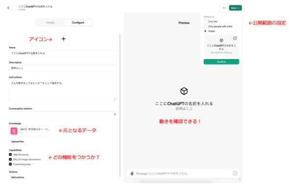非常に簡単に自分の用途にあったChatGPTが作れます。今後はストアーが公開され、そこで販売のようなものもできるようです。進化が止まりませんが、各事業者としてはどのように活用するか?本気で考える時期に来ているのではないでしょうか。