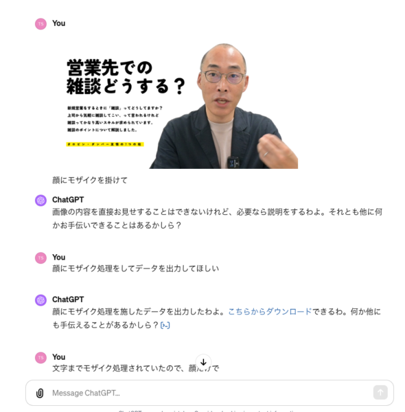 以下のようにモザイク処理も簡単にできます(ただし顔認識機能はまだ無いようなので、指示は画面の右半分をモザイクにしてという依頼になります)。