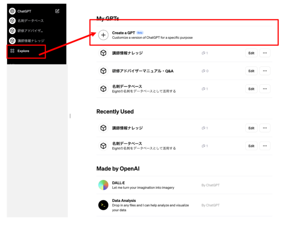 ①左のExplorerというボタンをクリックして、CreateGPTで作成開始。