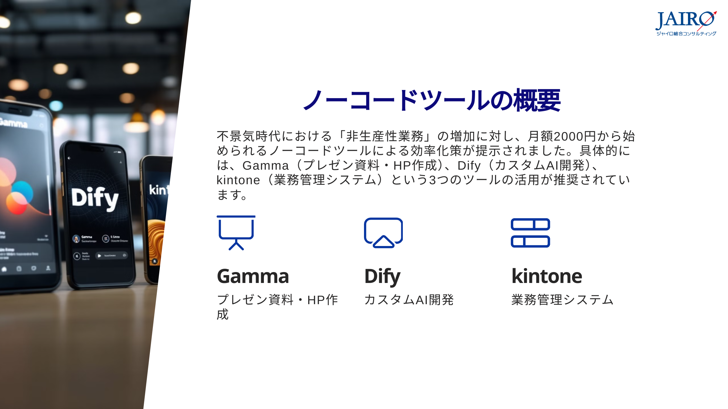 不景気時代における「非生産性業務」の増加に対し、月額2000円から始められるノーコードツールによる効率化策が提示されました。具体的には、Gamma(プレゼン資料・HP作成)、Dify(カスタムAI開発)、kintone(業務管理システム)という3つのツールの活用が推奨されています。