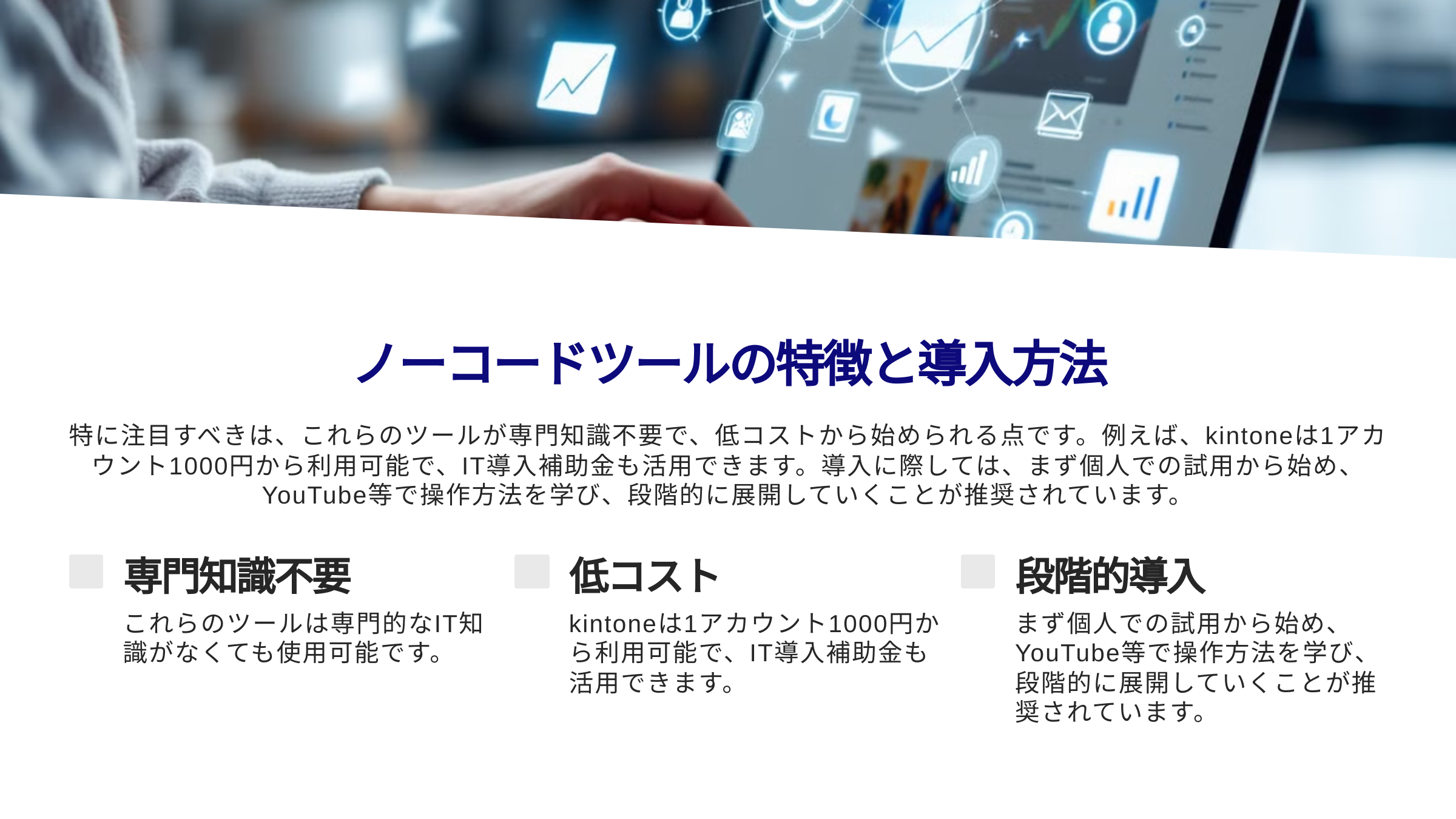 特に注目すべきは、これらのツールが専門知識不要で、低コストから始められる点です。例えば、kintoneは1アカウント1000円から利用可能で、IT導入補助金も活用できます。導入に際しては、まず個人での試用から始め、YouTube等で操作方法を学び、段階的に展開していくことが推奨されています。