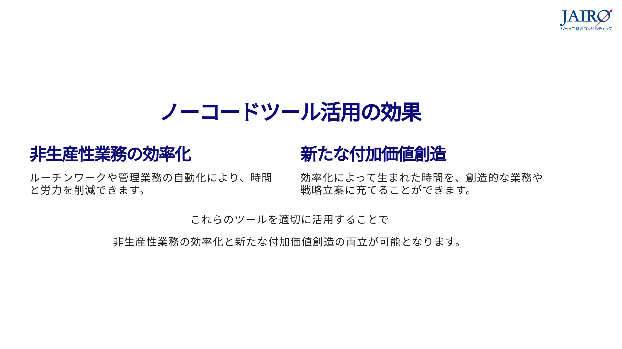 今後の展望として、AIやノーコード技術はさらに進化し、より使いやすく、より高度な機能が提供されていくでしょう。しかし、重要なのは技術そのものではなく、それをどう活用して業務を効率化し、新たな価値を生み出すかというビジョンです。