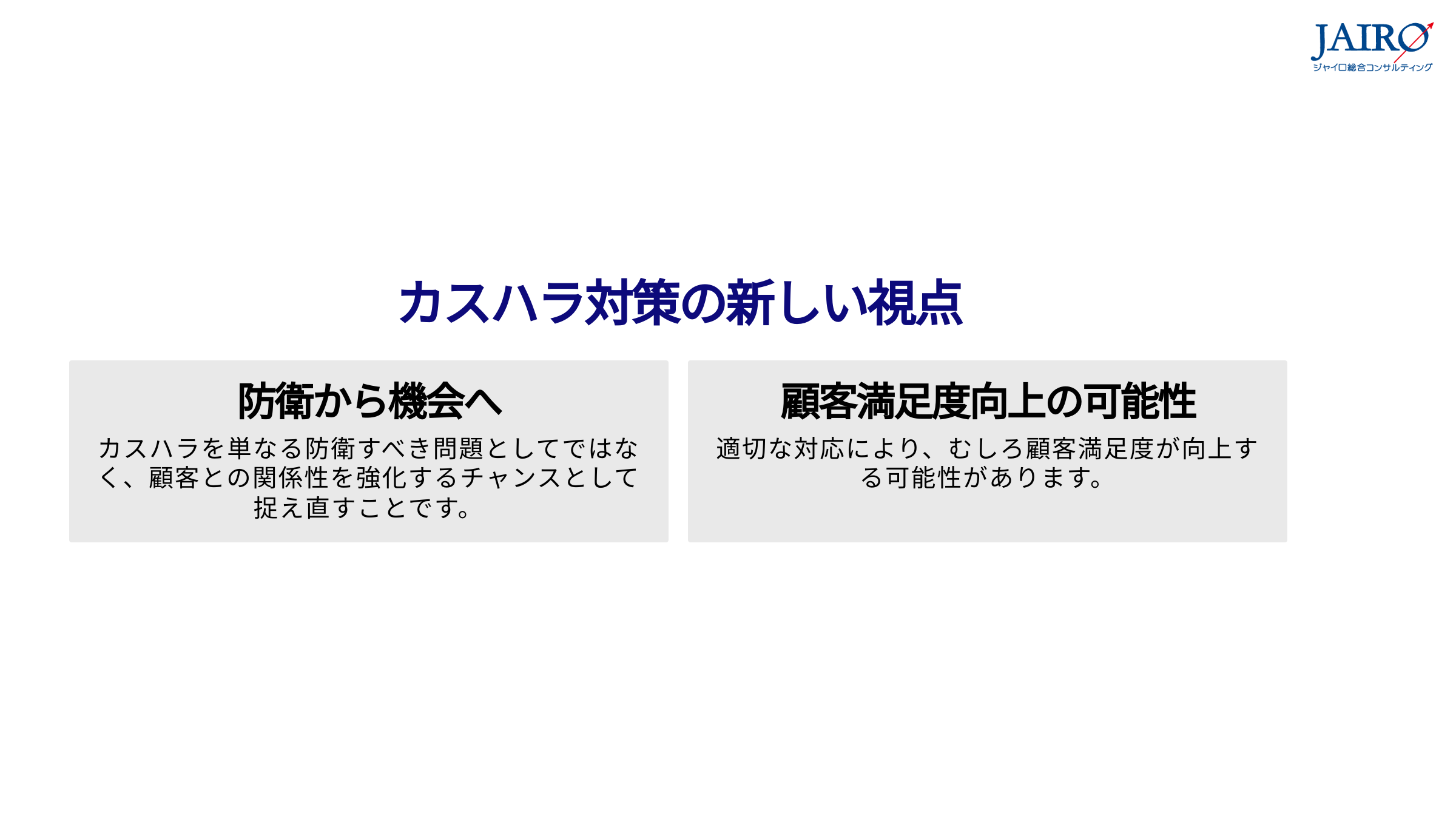 重要なポイントは、カスハラを単なる防衛すべき問題としてではなく、顧客との関係性を強化するチャンスとして捉え直すことです。適切な対応により、むしろ顧客満足度が向上する可能性があります。