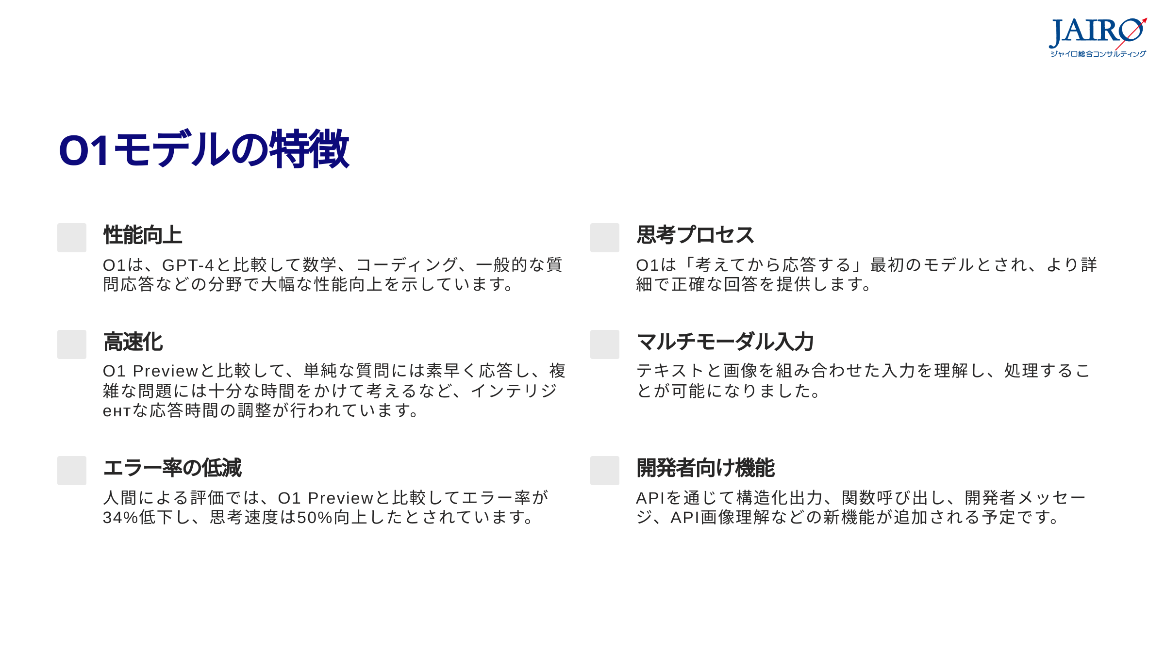 O1は、これまでのGPT-4を大きく上回る性能を持ち、より高度で複雑なタスクをこなすことができます。特に、速度と多様な入力への対応力が飛躍的に向上しています。