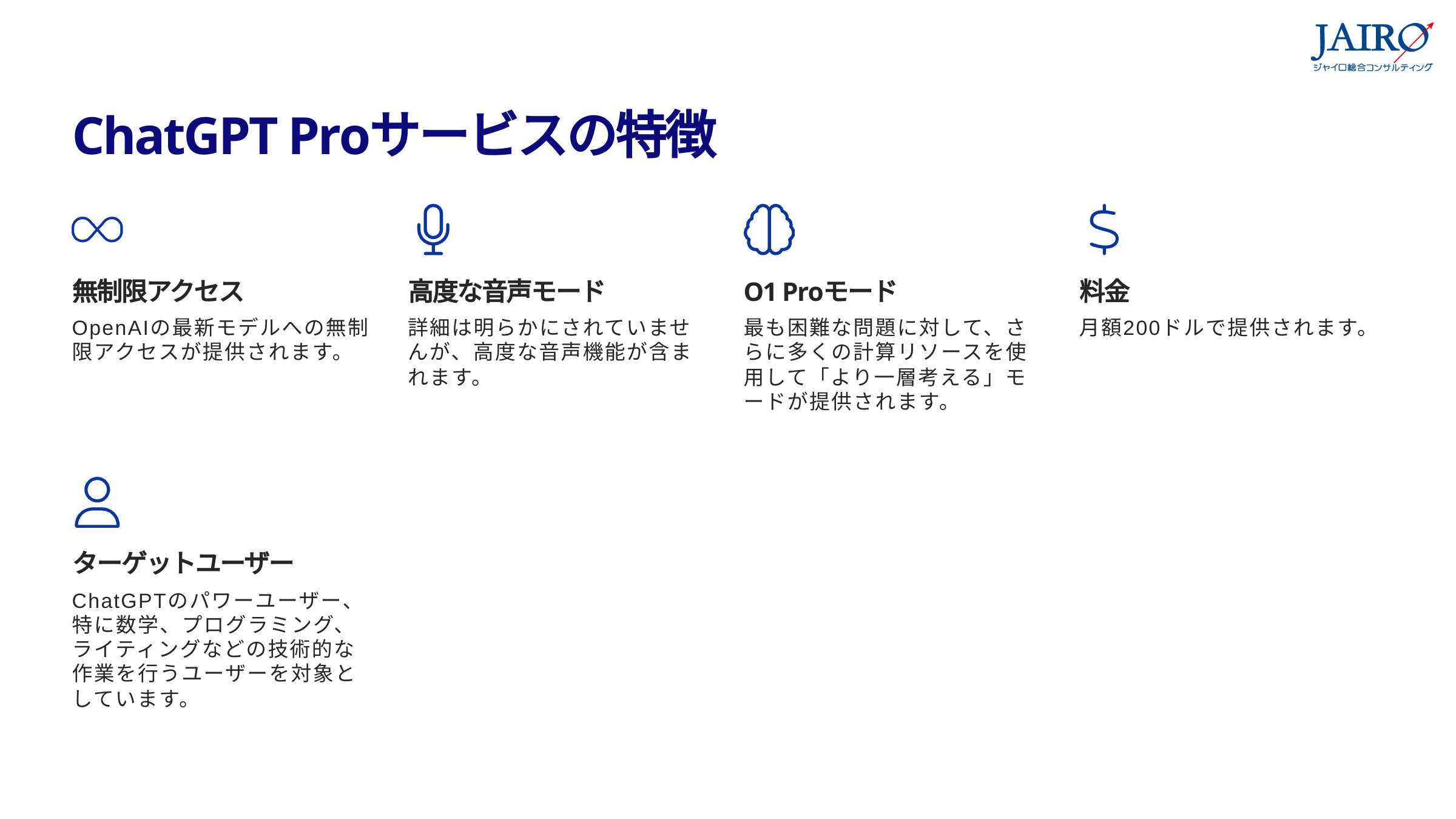 ChatGPT Proは、AIをより集中的に利用したいパワーユーザーや企業向けのサービスです。高度な機能と無制限のアクセスにより、複雑なビジネス課題の解決や新サービスの開発に活用できます。