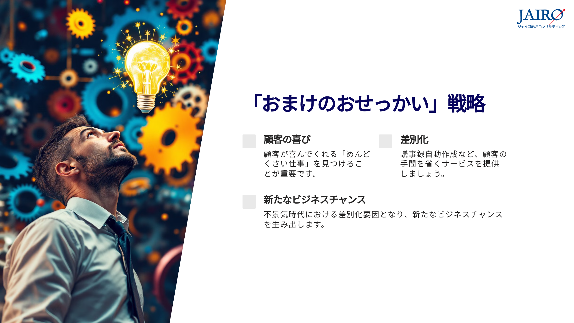 AIを活用する上で最も重要なのは、めんどくさい仕事をどこで手伝ってもらえば顧客が喜んでくれるかを考えることです。これを「おまけのおせっかい」と呼んでいます。