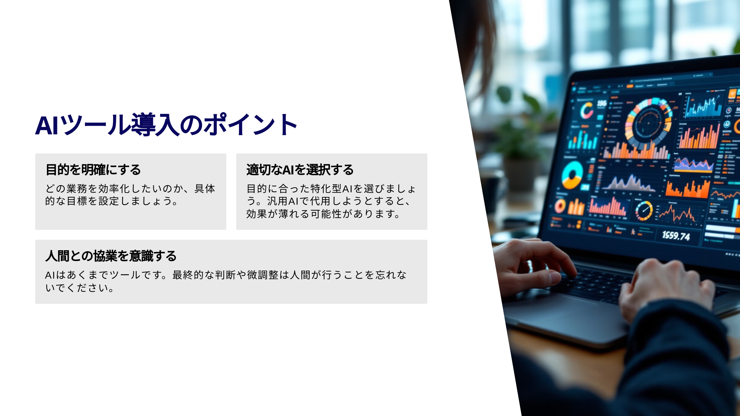 AIツールを実際に導入する際のポイントと、今後の展望について詳しく見ていきましょう。