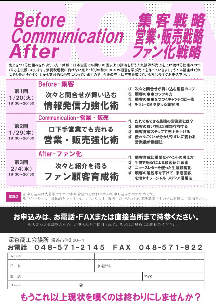 本日より3日間にわたり深谷商工会議所煮て、売上アップ塾が始まります。