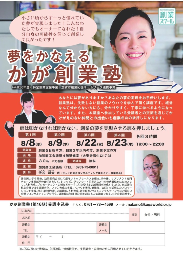 来週は加賀商工会議所で創業塾の講師として登壇させていただきます。