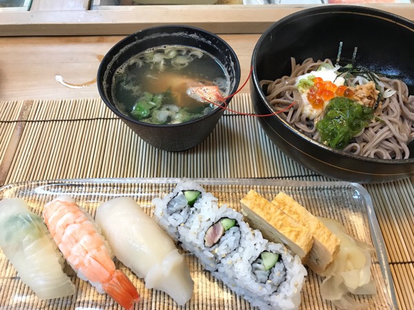 今日のランチは地元で有名なお店で蕎麦と寿司ランチ。なんとこれで1,000円だもの!