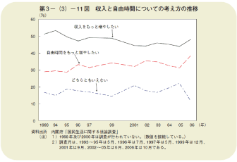 「国民生活に関する世論調査」(内閣府、下記グラフ参照)から、収入と自由時間についての考え方の推移をみてみますと、傾向としては、「収入をもっと増やしたい」とする者の割合が徐々に低下し、「自由時間をもっと増やしたい」とする者の割合が次第に高まっており、その差はわずか10ポイント程度に縮まっており、労働者の意識が変化していることが分かります。