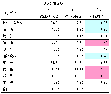 雑貨などかさばる商品や、戦略的に品揃えを行う場合には、必ずしも1.0にこだわる必要はない。しかし、B店の売場を見ると、かつて売れ筋だった洋酒が多くの棚を占め、かつ雑貨も店頭を在庫スペース代わりに使うなど、明らかにアンバランスなものであった。そこで、