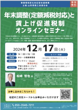 【山形県商工会連合会主催】「2024年度 年末調整(定額減税対応)と賃上げ促進税制オンラインセミナー」開催のお知らせ
