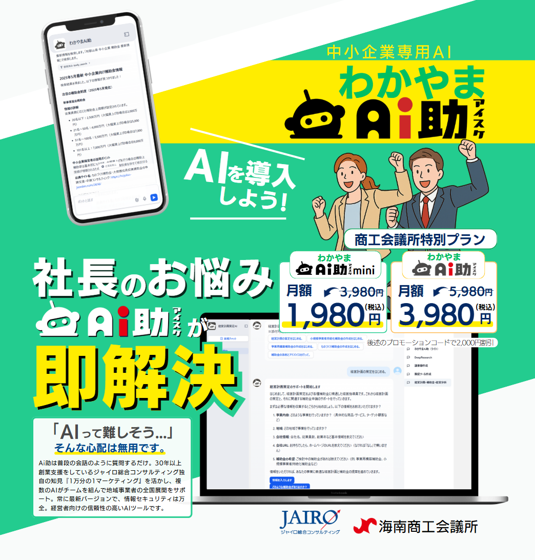 【提供開始!】AI支援ツール「わかやまAi助」海南商工会議所主導のAI支援サービスで地域企業の経営を加速させます!