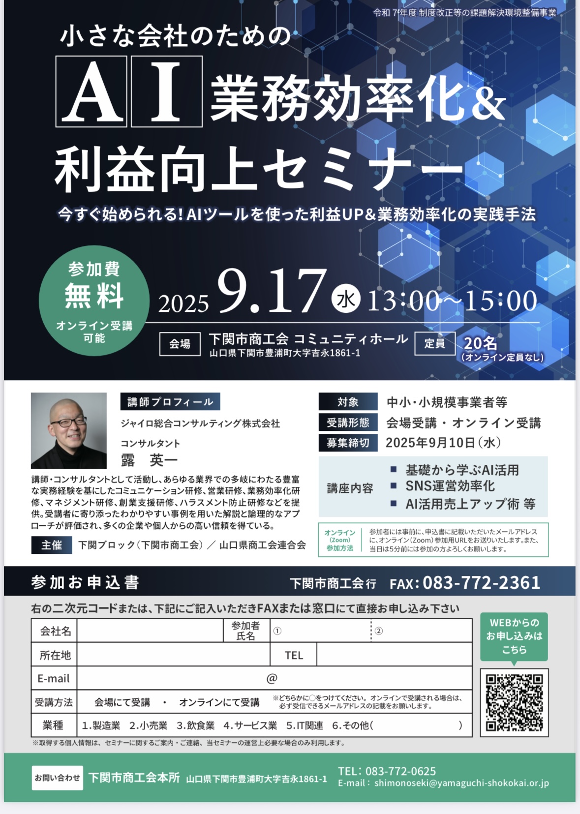 【下関市商工会・山口県商工会連合会主催】「2025年度 AIで業務効率化」開催のお知らせ