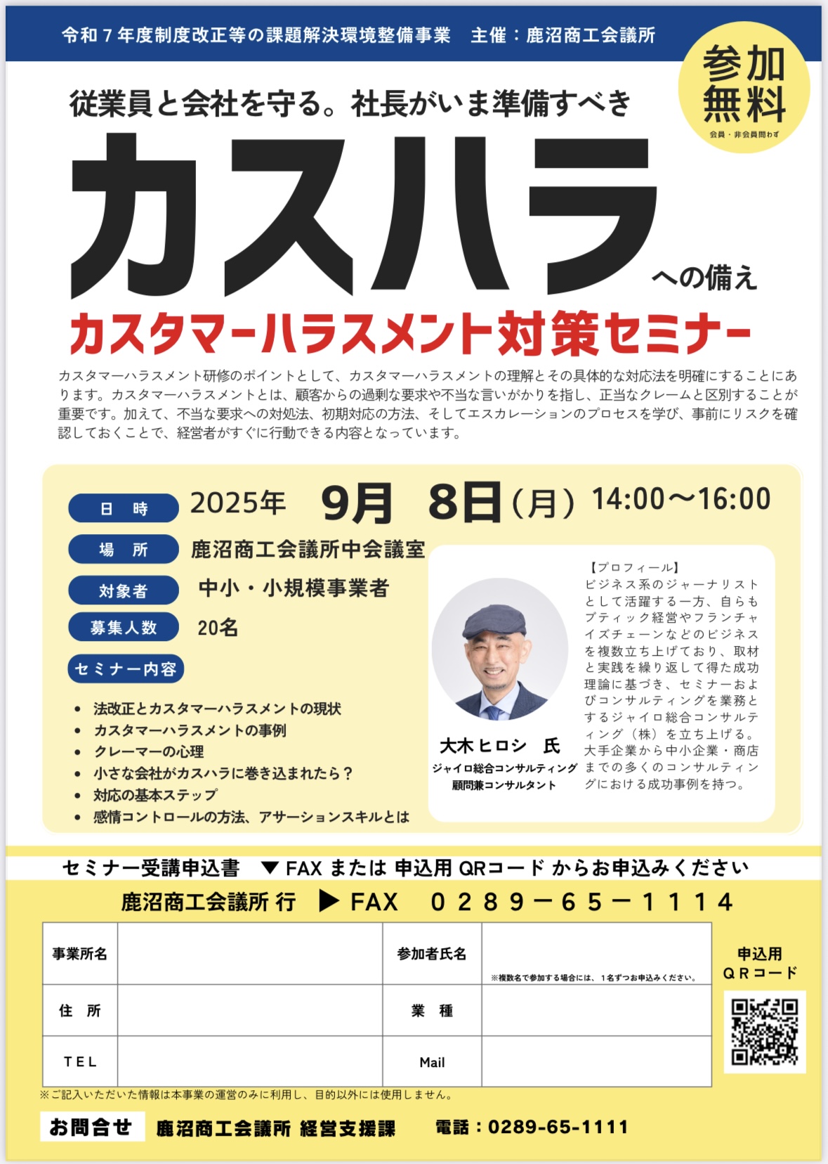 【鹿沼商工会議所主催】「2025年度 カスタマーハラスメント対策セミナー 」開催のお知らせ