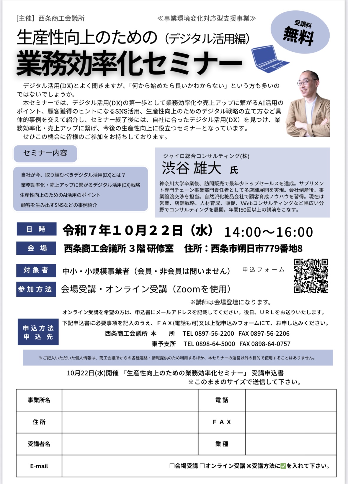 【西条商工会議所主催】「2025年度 生産性向上の為の業務効率化セミナー」開催のお知らせ