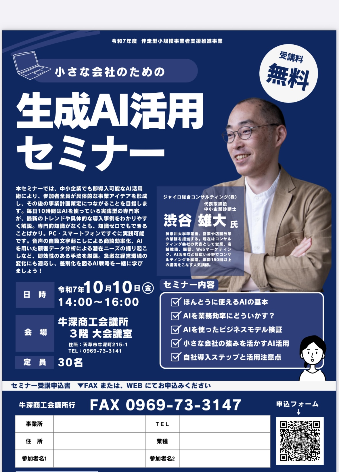 【牛深商工会議所主催】「2025年度 小さな会社のための生成AI活用セミナー」開催のお知らせ