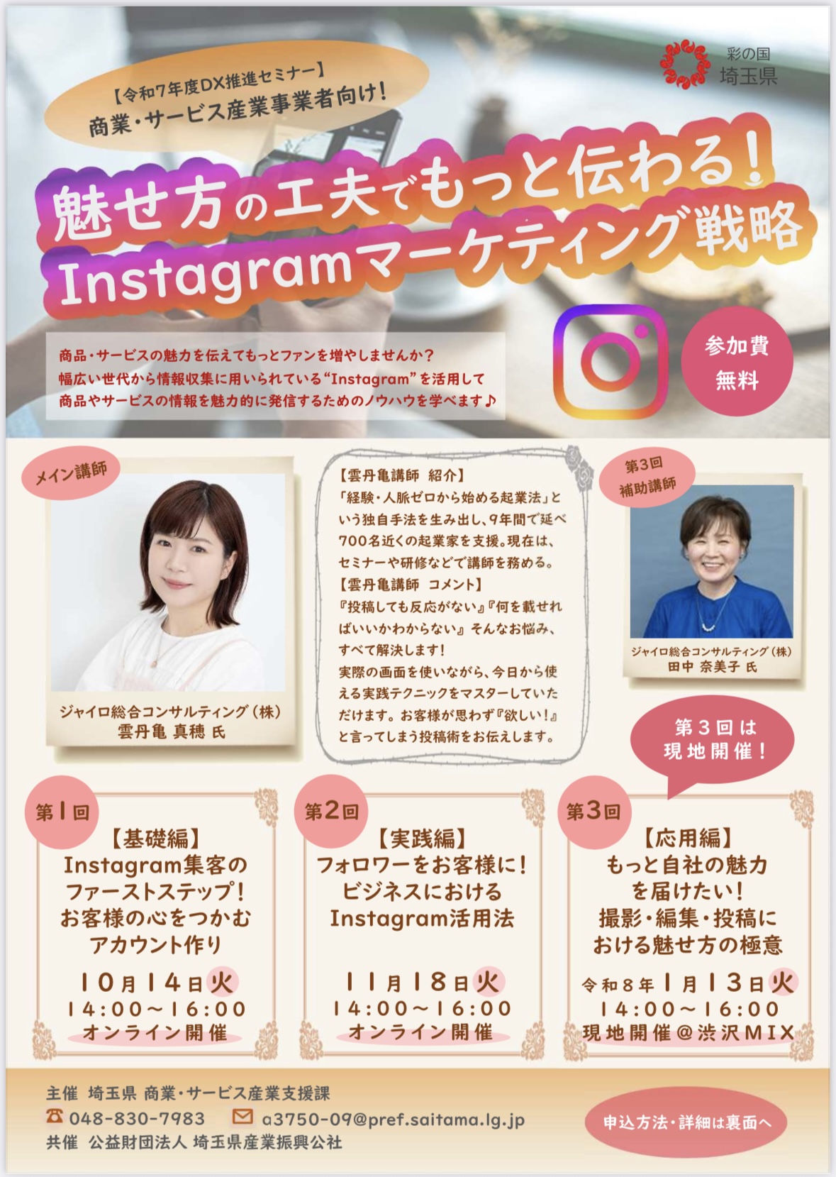 【埼玉県 商業サービス支援課主催】「2025年度 魅せ方の工夫でもっと伝わるInstagramマーケティング戦略」開催のお知らせ