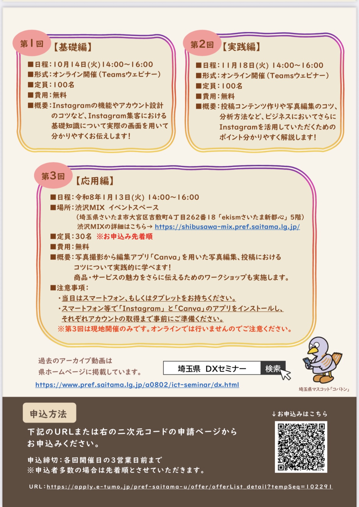 埼玉県 商業サービス支援課| 日時 | 基礎編:10月14日(火)14:00~16:00 実践編:11月18日(火)14:00~16:00 応用編:8年1月13日(火)14:00~16:00 |