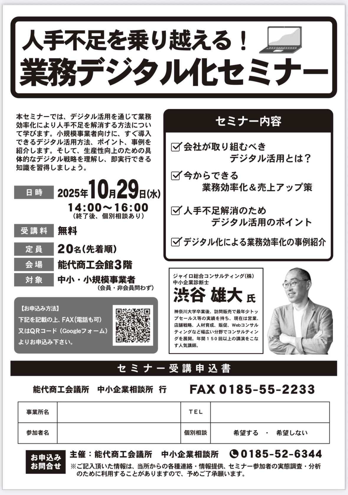 【能代商工会議所主催】「2025年度 人手不足を乗り超える業務デジタル化セミナー」開催のお知らせ