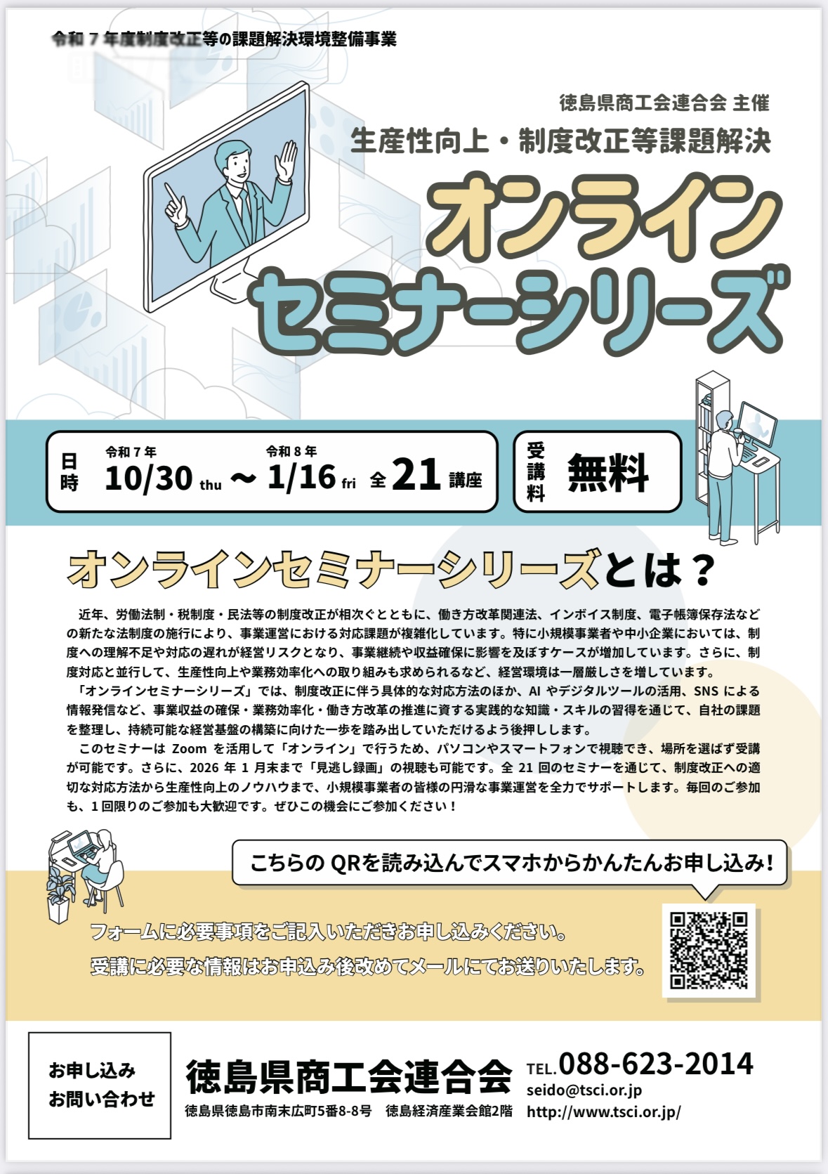 【徳島県商工会連合会主催】「令和7年度制度改正等の課題解決環境整備事業オンラインセミナーシリーズ」開催のお知らせ