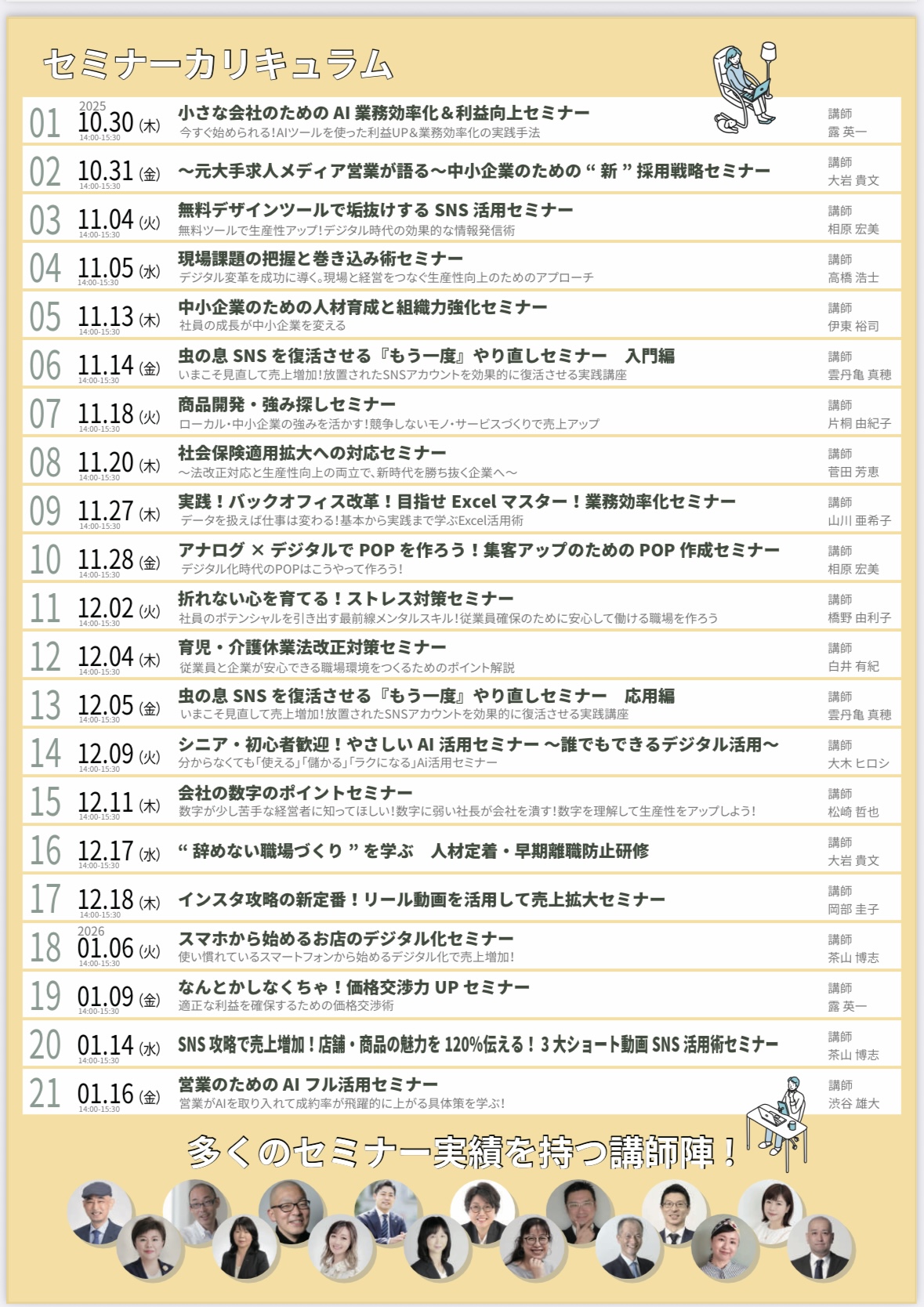 このセミナーは Zoom を活用して「オンライン」で行うため、パソコンやスマートフォンで視聴でき、場所を選ばず受講が可能です。さらに、2026 年 1 月末まで「見逃し録画」の視聴も可能です。全 21 回のセミナーを通じて、制度改正への適切な対応方法から生産性向上のノウハウまで、小規模事業者の皆様の円滑な事業運営を全力でサポートします。毎回のご参加も、1 回限りのご参加も大歓迎です。ぜひこの機会にご参加ください!