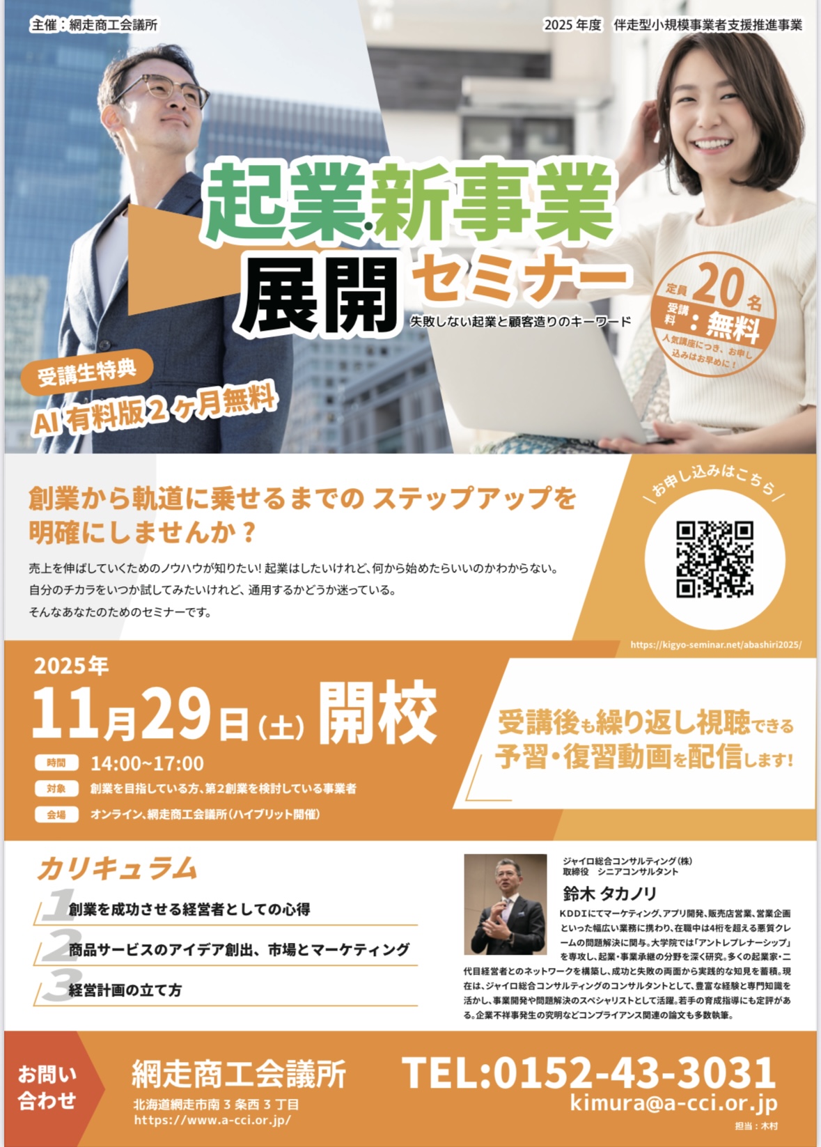 【網走商工会議所主催】「2025年度 失敗しない起業と顧客づくりのキーワード」開催のお知らせ