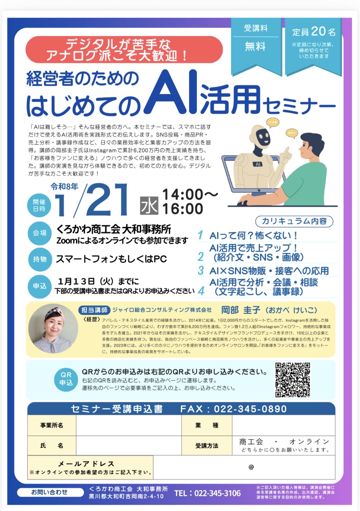 - 【くろかわ商工会 大和事務所主催】「2025年度 経営者のための はじめてのAI活用セミナー」開催のお知らせ