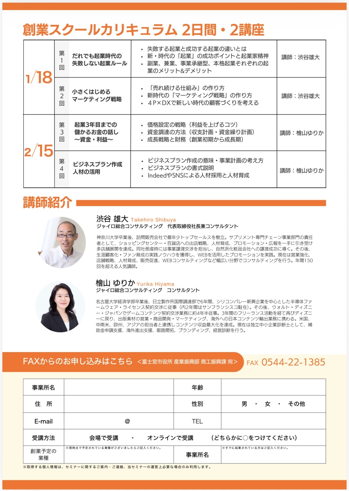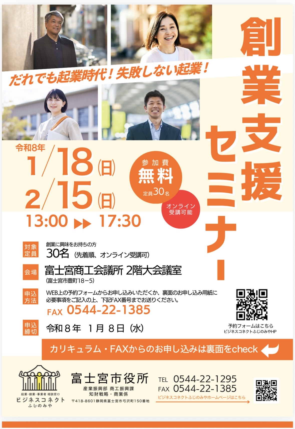 【起業・創業・事業者 相談窓口 ビジネスコネクト ふじのみや富士宮市役所主催】「2025年度 創業支援セミナー」開催のお知らせ