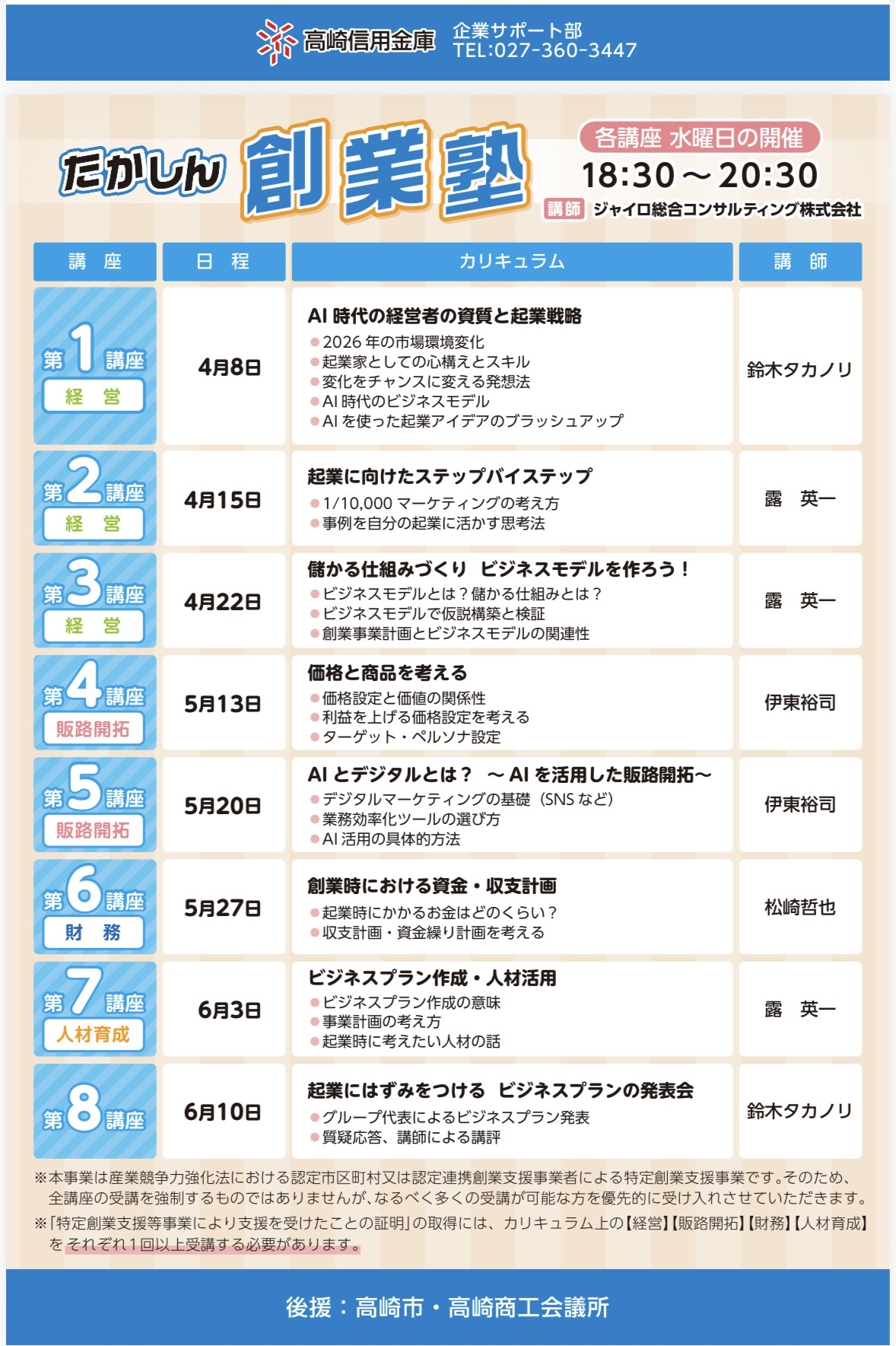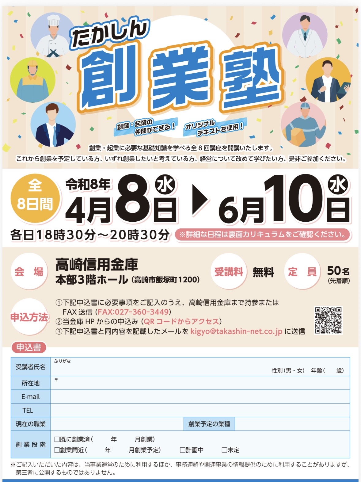 - 【高崎信用金庫主催】「2026年度 企業サポート部たかしん創業塾」開催のお知らせ