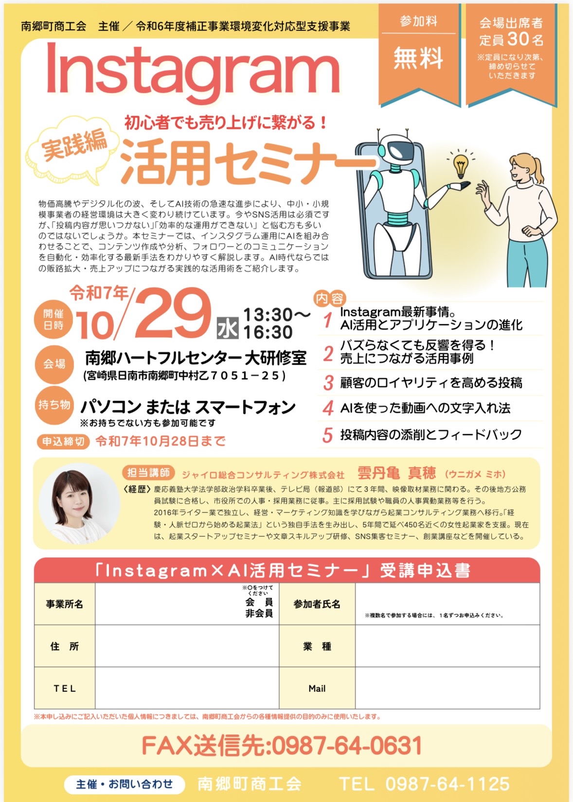 - 【南郷町商工会主催】「2025年度Instagram活用セミナー」開催のお知らせ