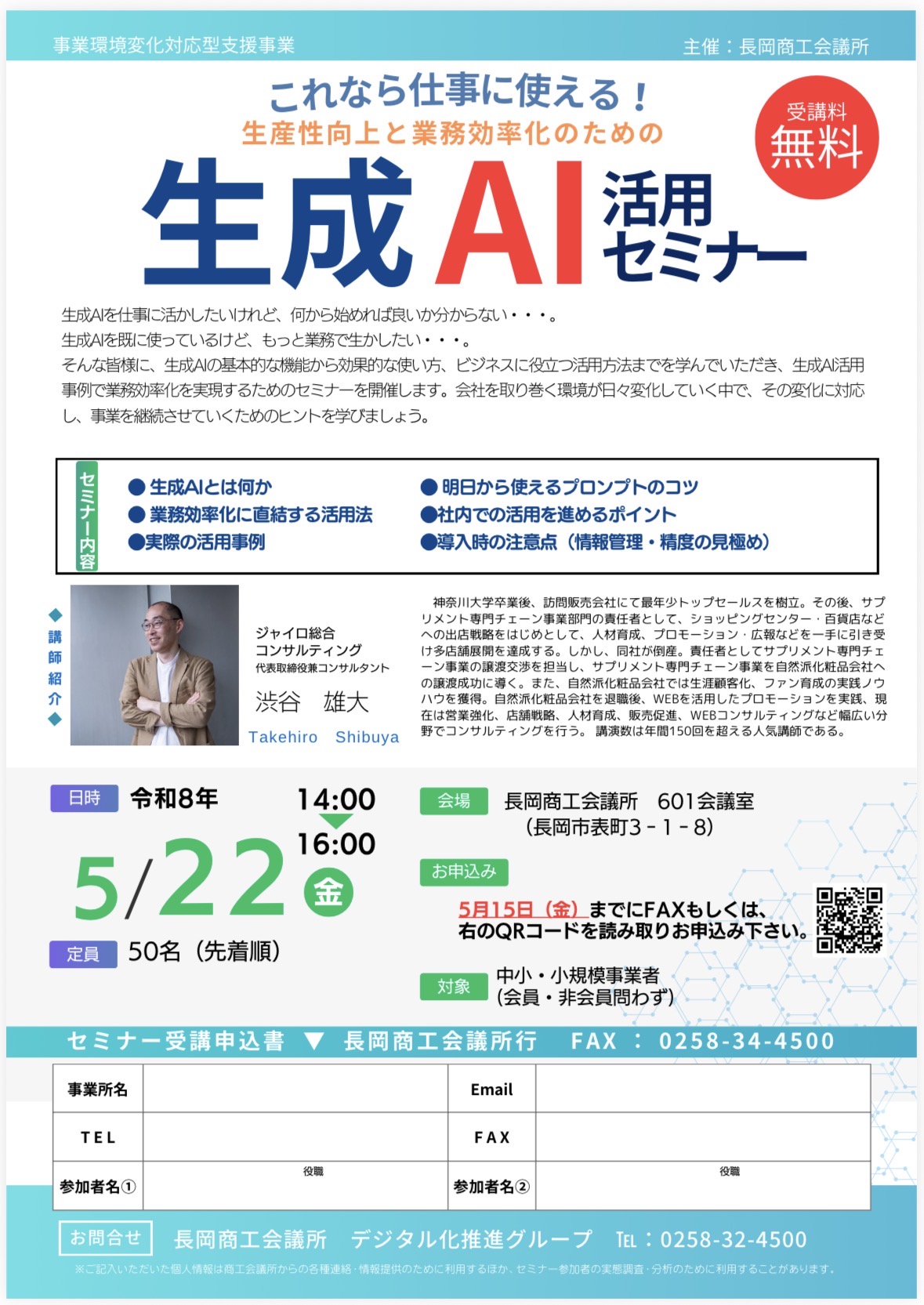 - 【長岡商工会議所主催】「2027年度これなら仕事に使える!生産性向上と業務効率化のための「生成AI活用セミナー」開催のお知らせ