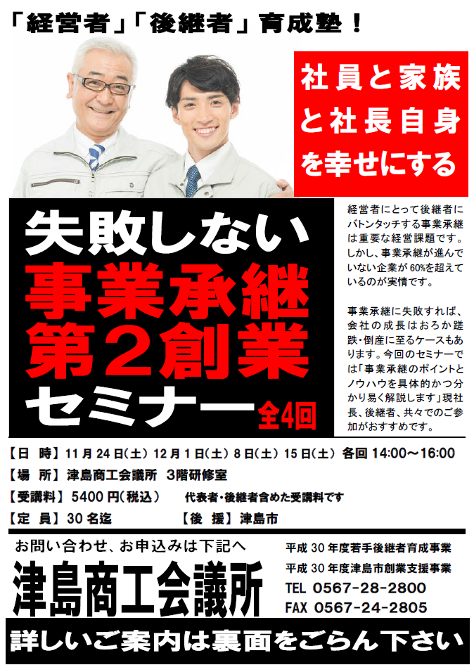 津島商工会議所「失敗しない 事業承継・第2創業セミナー 全4回」開催のお知らせ