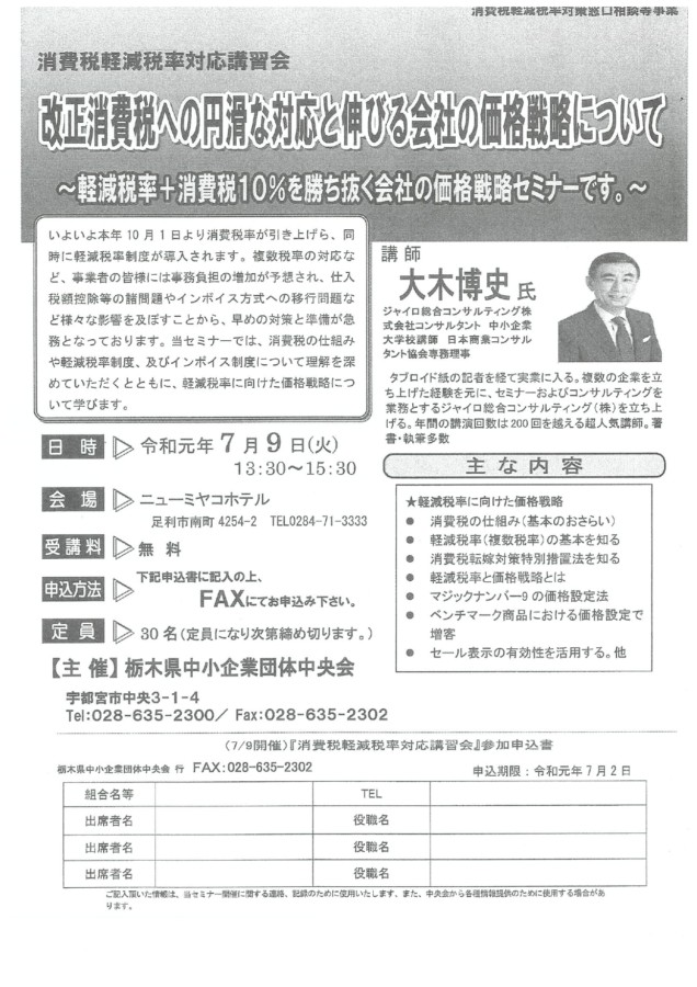 栃木中小企業団体中央会「消費税軽減税率対応講習会」開催のお知らせ