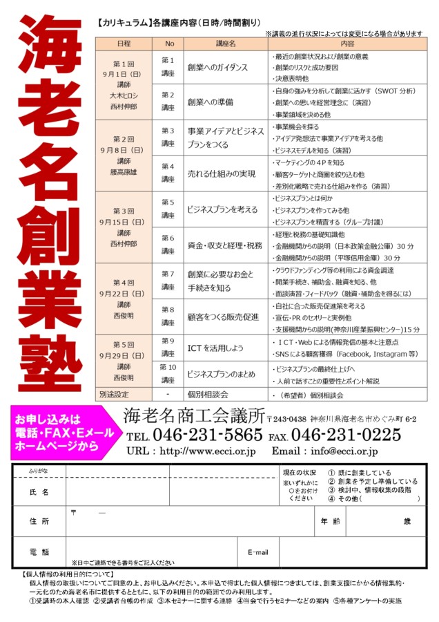 | お問い合わせ | 海老名商工会議所 経営支援部 TEL:046-231-5865 FAX:046-231-0225 |