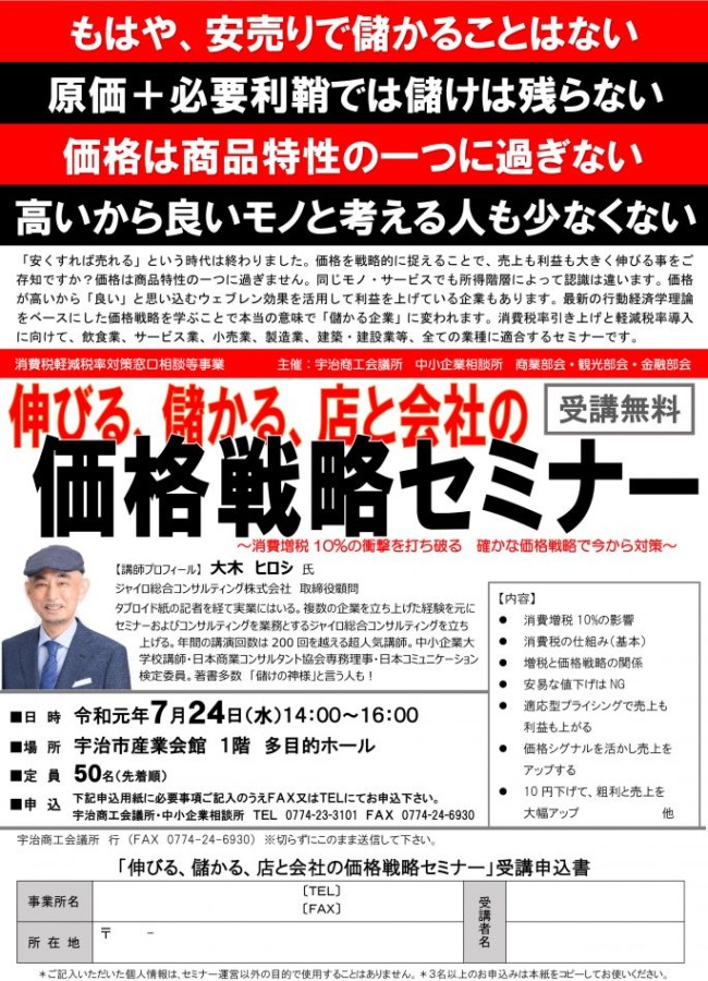 宇治商工会議所では、2019年7月24日(水)に、消費税軽減税率対策セミナー「伸びる、儲かる、店と会社の価格戦略セミナー」を開催いたします。