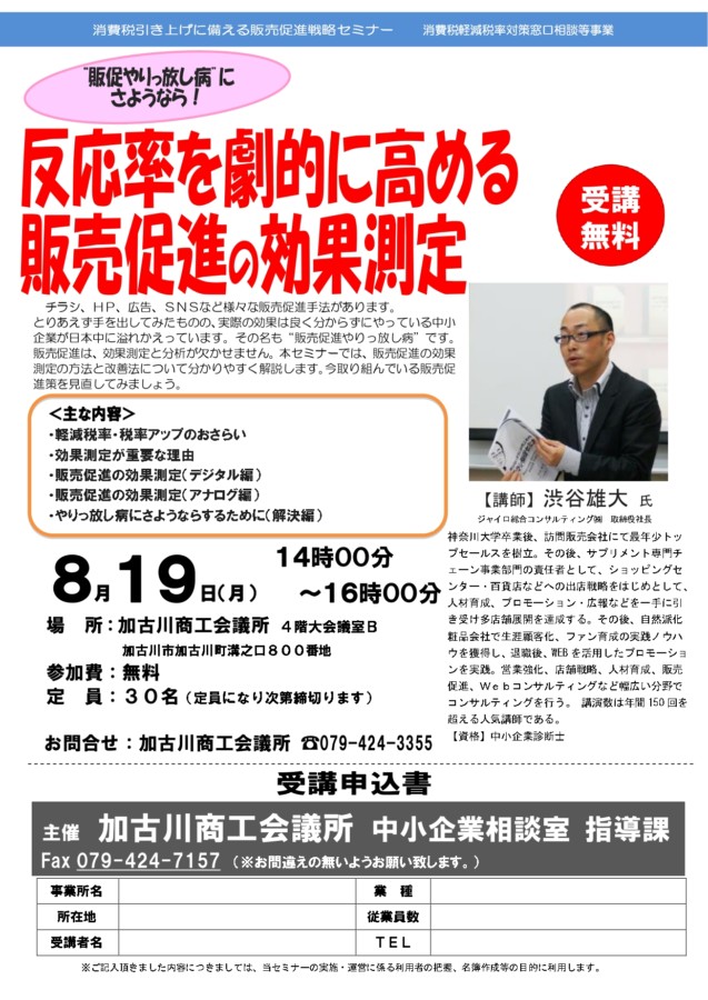 加古川商工会議所「消費税引き上げに備える販売促進戦略セミナー 」開催のお知らせ