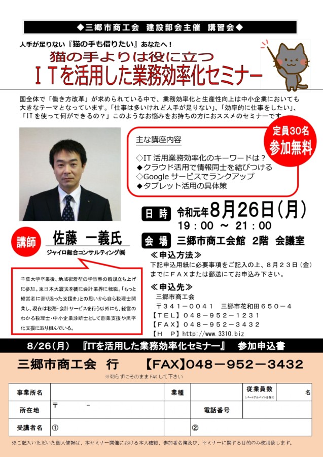 三郷市商工会「猫の手よりは役に立つ ITを活用した業務効率化セミナー」開催のお知らせ