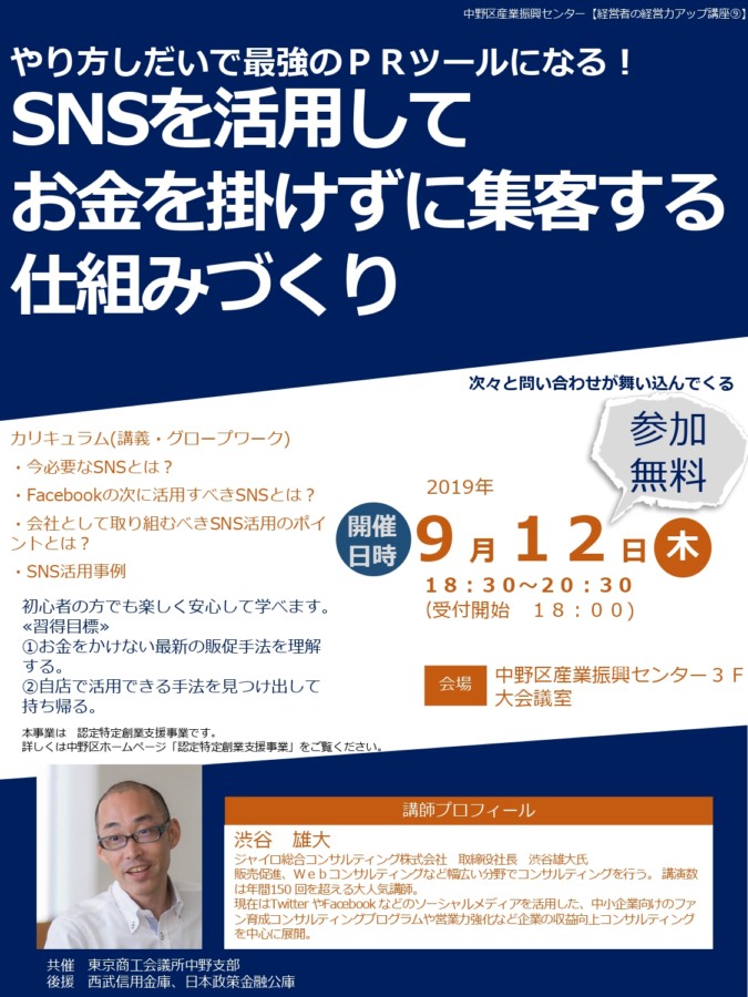 中野区産業振興センター「やり方しだいで最強のPRツールになる! SNSを活用してお金を掛けずに集客する仕組みづくり」開催のお知らせ
