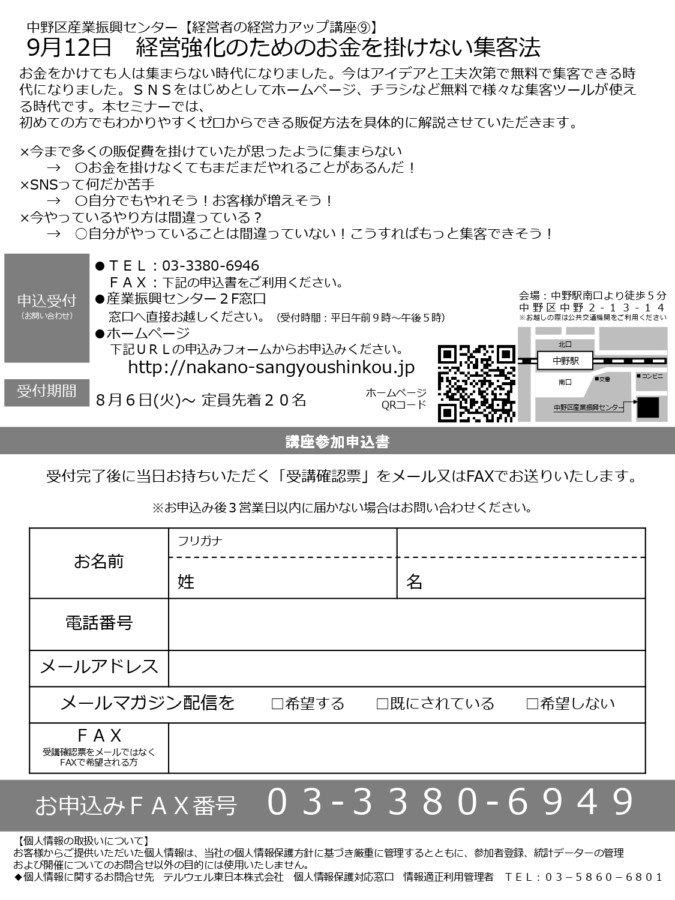セミナーチラシに必要事項をご記入の上、中野区産業振興センターまでFAX(03-3380-6949)にてお申し込みください。