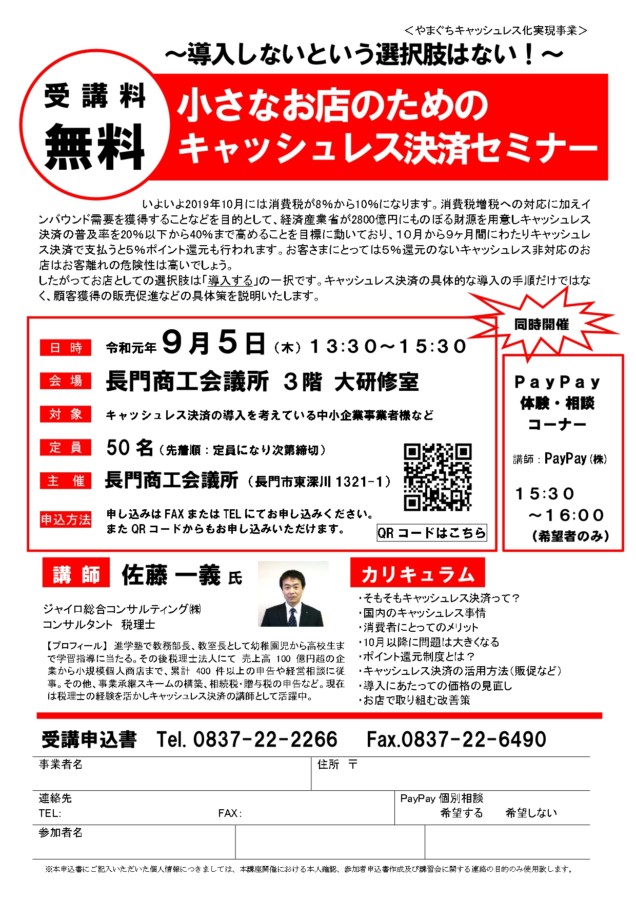 長門商工会議所「小さなお店のための キャッシュレス決済セミナー」開催のお知らせ
