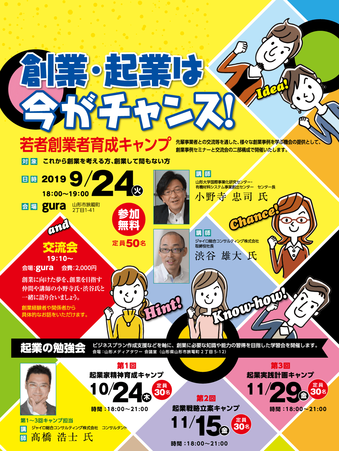 今、求められている人材は、自らの考えを持って挑戦する人。個々に合った働き方の選択肢も増えています。その一つが起業です。起業することは自己実現だけでなく、地域に活力を与える重要なファクターにも。「やまがたビジネスアイデア博」では、将来、県内での起業・創業に興味のある方や、起業・創業しようという方々を応援しようという方、学生の方も参加できる「若者創業者育成キャンプ」を開催します。なぜ起業がGOODなのか、今がチャンスなのか、創業に必要な知識やノウハウは、リスク管理は…など、キャンプではこうした様々な疑問にお答えします。「自分の可能性を試したい」という方、ぜひ一度、足を運んではいかがですか?