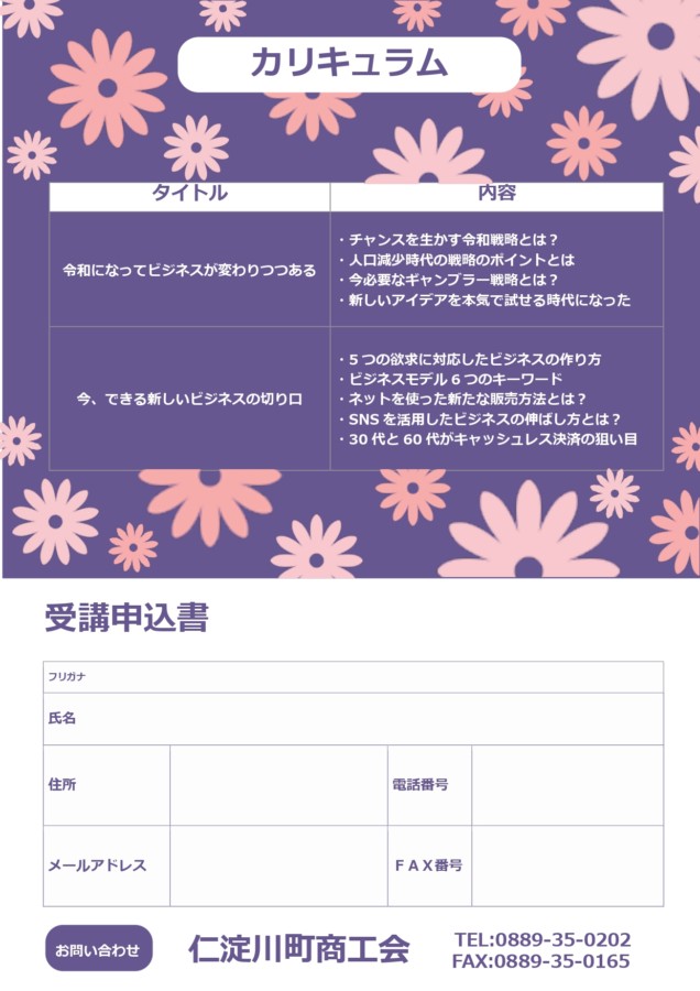 セミナーチラシに必要事項をご記入の上、仁淀川町商工会(FAX:0889-35-0165)までお申し込みください。