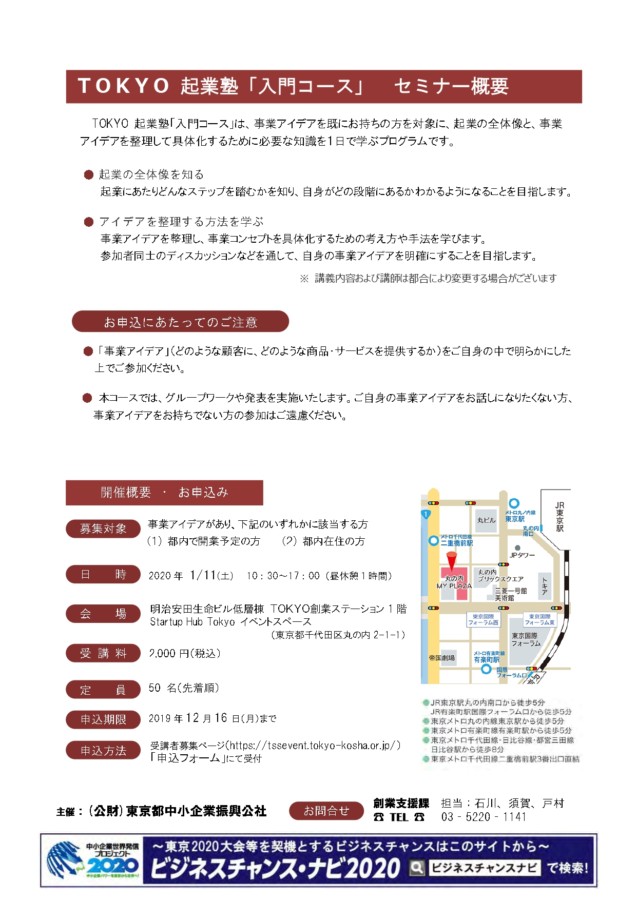 TOKYO創業ステーション「令和元年度TOKYO起業塾“入門コース”」開催のお知らせ