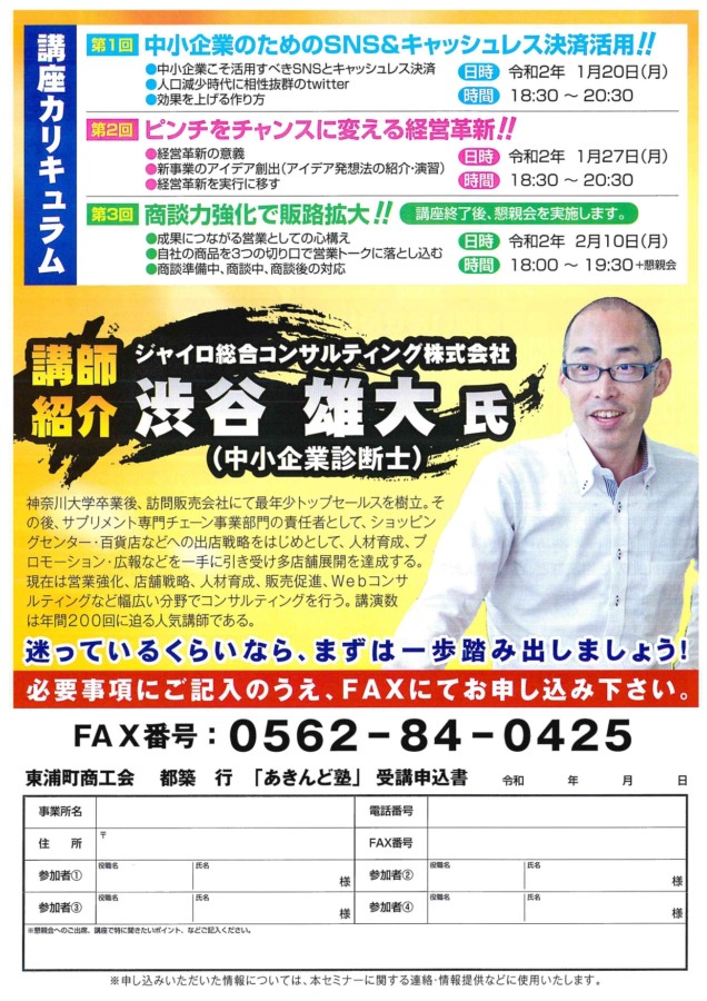 東浦町商工会・大府商工会議所「令和元年度 あきんど塾」開催のお知らせ
