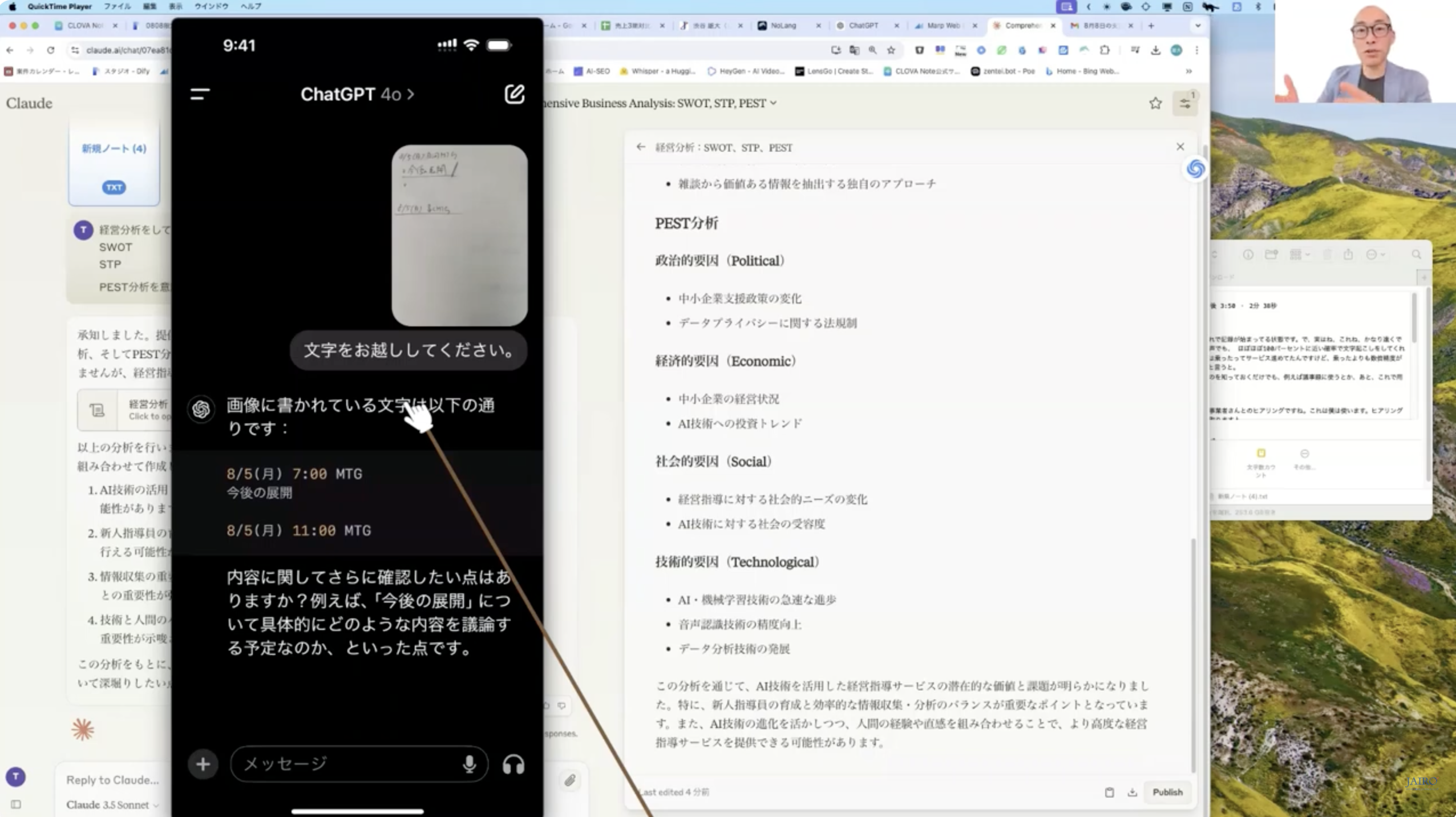 このツールを使えば、経営指導員の方々が事業者とのヒアリング内容を簡単に記録できます。さらに、このデータをAIに分析させることで、SWOTやSTP分析、4P分析なども一瞬で行えます。