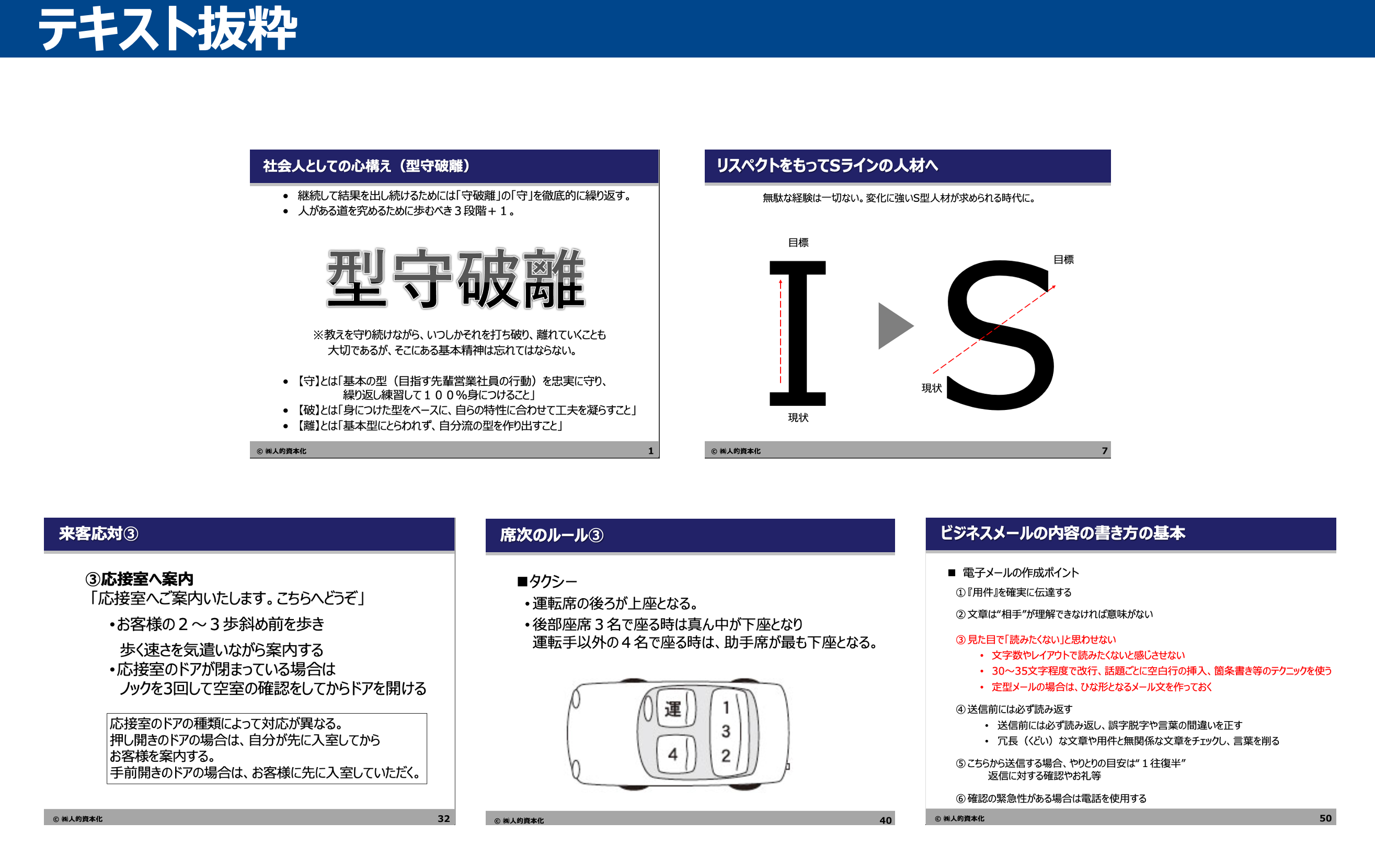 | 3 | 社会人としての心構え③ 〜あなたの成長を考える〜 収録時間:29分 | •型守破離の考え方 •中期的に成長するための学習曲線 •リスペクトの考えを持つ |